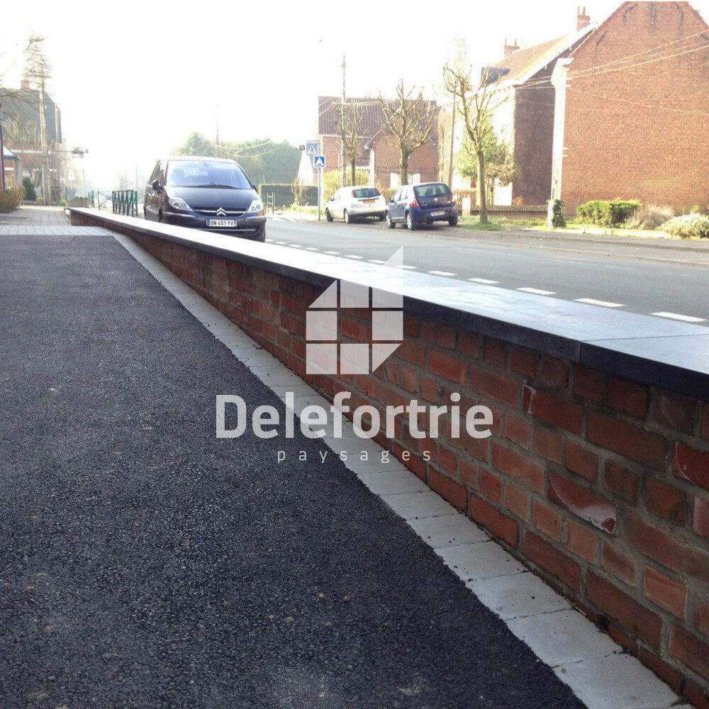 Le revêtement de surface en enrobé coulé à chaud et réalisé avec une pente à 2 %, le calepinage moderne des pavés en pierre bleue permet de mettre en valeur le muret maçonner en brique (réaliser par nos soins).
