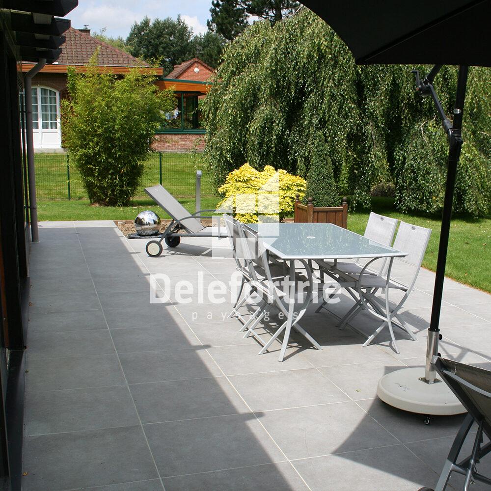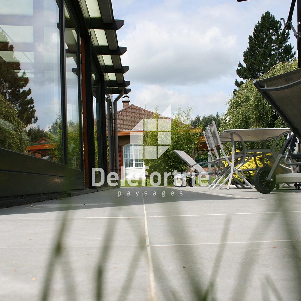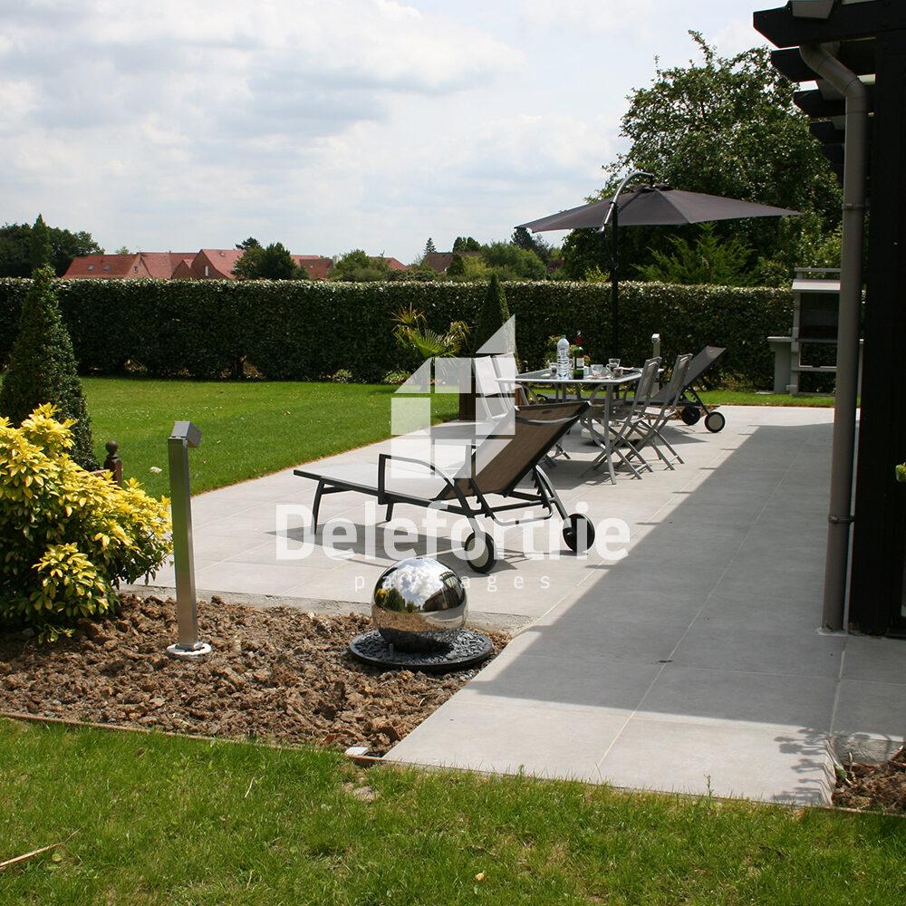 Sollicitées pour penser puis réaliser l’aménagement extérieur de cette maison de construction contemporaine à Fleurbaix, les équipes de Delefortrie Paysages ont suggéré une terrasse en carrelage design de couleur gris clair pour contraster harmonieusement avec les baies vitrées de la véranda et les briques et tuiles aux teintes rouges comme avec le gazon logiquement verdoyant. Ce sont des dalles de céramique 60 x 60 qui composent cette terrasse contemporaine au design épuré.
